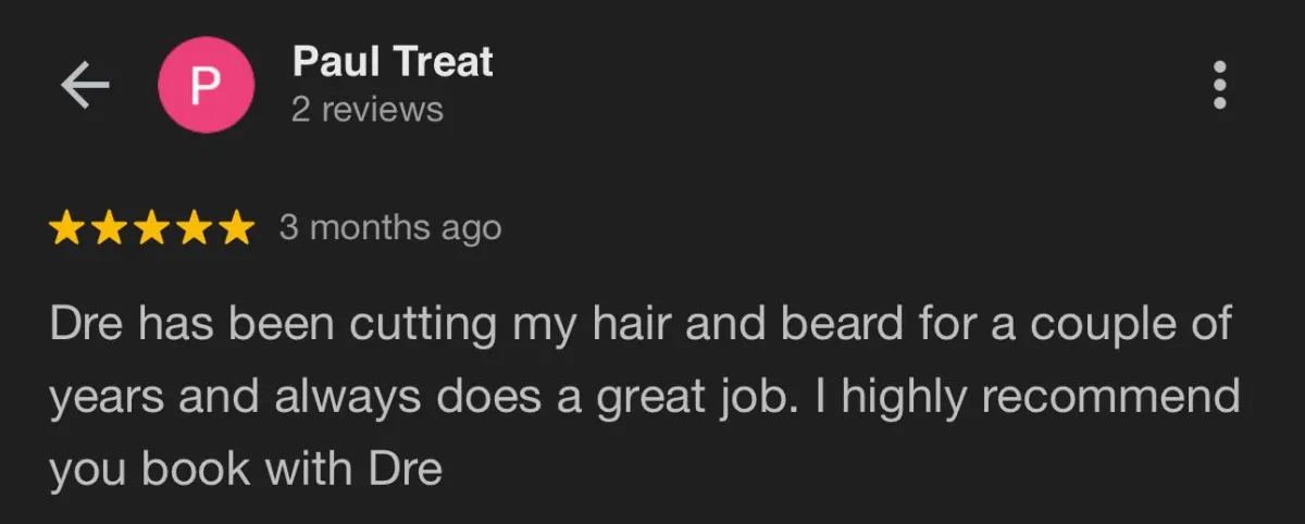 A: Dre specializes in a variety of services, including fades, beard trims, classic haircuts, and custom styles. Whatever you need, he’s got you covered.